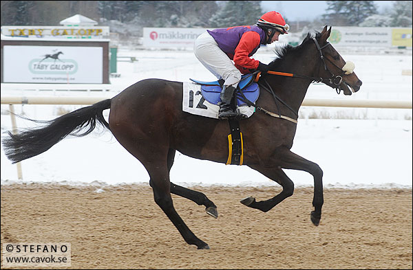 Min fotoverksamhet går verkligen på lågvarv vid den här tiden på året. Därför är det knappast märkligt att det inte trillar in så många bildförfrågningar. Men igår kom det ett mejl från Jenny, som undrar om jag har någon bild på hästen Indian Ace. Ja, faktiskt! Indian Ace startade på Täby Galopp den 23 november med Rebecca Colldin i sadeln. Då var jag på plats och lyckades fånga Indian Lodge-stoet i nedstartsgaloppen.