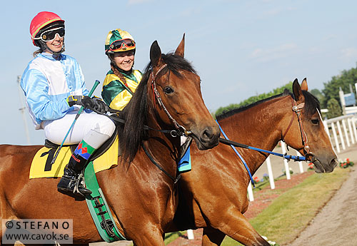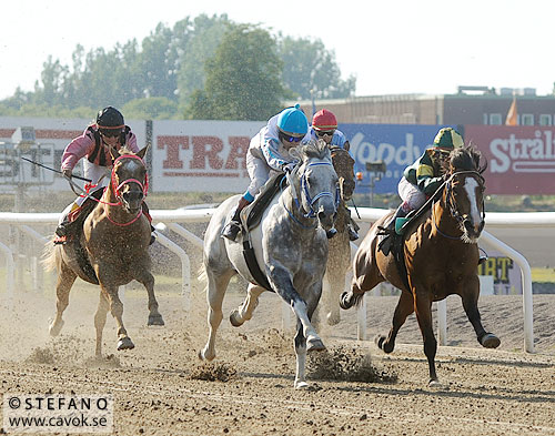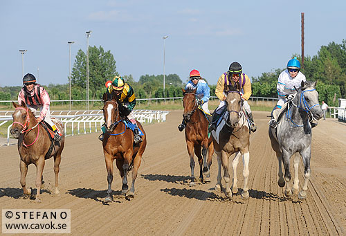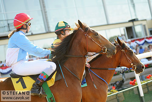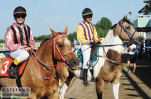 Jag lovade Anette att lägga ut lite bilder från lördagens lopp med Quarterhästar på Jägersro. Ett klart trevligt inslag tycker jag. Fort som tusan gick det. Ni ser kanske att det är Anette Svensson, Annelie Hollstenius, Nathalie Andersson, Tina Henriksson och Therese Hansson som rider. Namnen på hästarna har jag dessvärre slarvat bort. Notera även att några av ryttarna rider med aningen längre stigläder än vanligt. Hästarna är ju inte så vana att gå med galoppsadel.