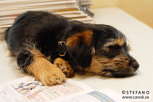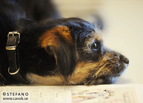 Maria frågade mig tidigare idag om jag inte kunde lägga ut några bilder på Herman. Nu snackar vi inte om någon häst utan en hundvalp. Herman tillbringade en del av lördagskvällen i Jägersros vågrum och charmade säkert ett flertal jockeys, toksöt som han är. Vi känner ju alla till att man snabbt blir sömnig av att läsa programmets formrader. Det gäller tydligen även hundvalpar… 🙂