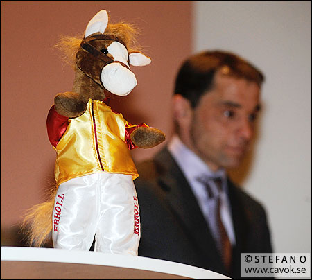 Människor fanns det gott om på Årets Hästfest i fredags. Allt från jockeys, tränare och annat löst galoppfolk. Men var höll egentligen alla hästarna hus? Var det inte lite nonchalant av Swing That Cat och Peas and Carrots att inte komma till festen nu när det fanns priser att hämta? Erroll höll i vilket fall stilen. Han tog sig smidigt upp på scenen för att ta emot publikens hyllningar som årets 2-åring 2008. Till på köpet sjöng han en liten sång och bjöd på ett par sköna ”dancemoves”. 🙂
